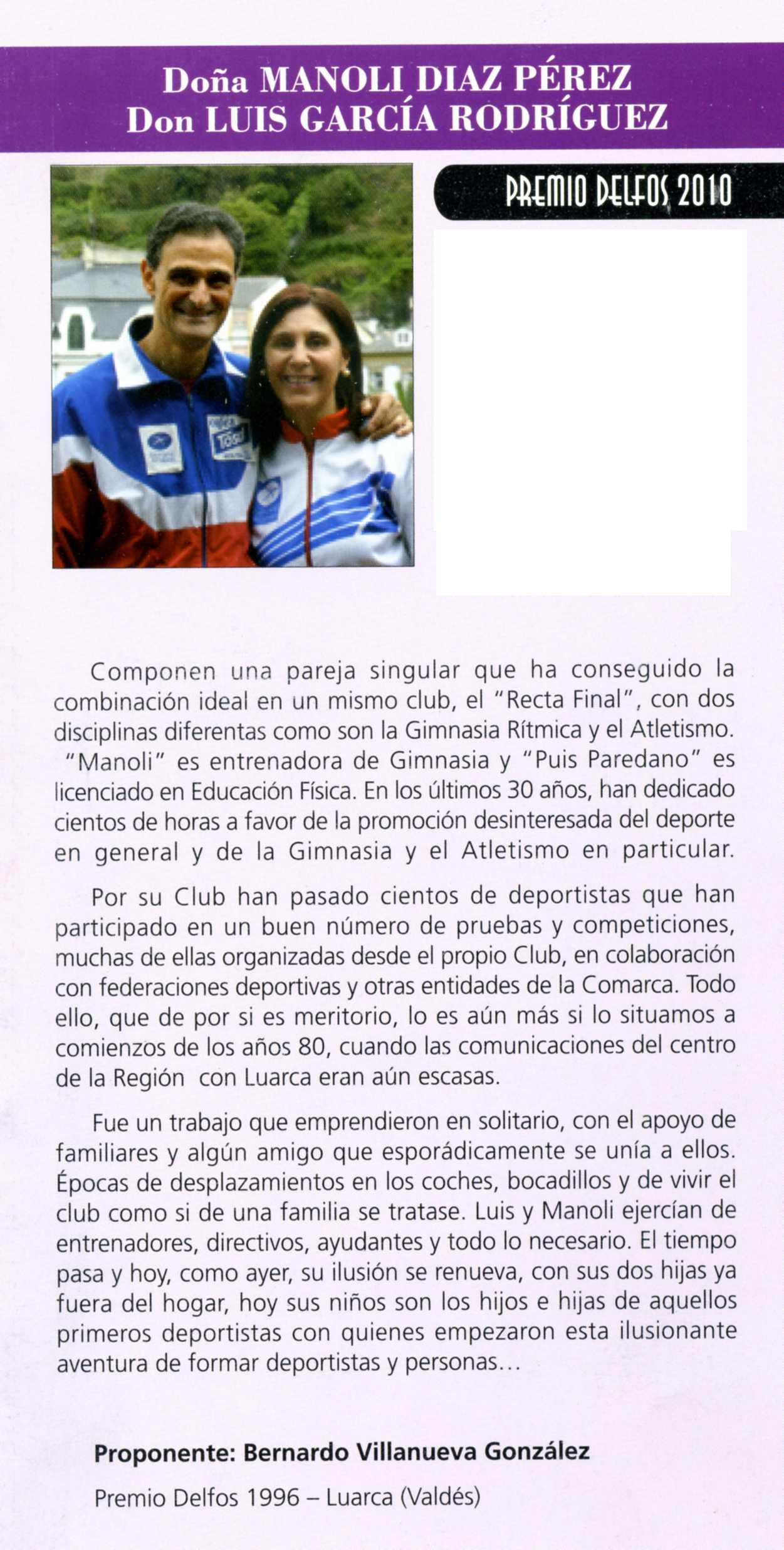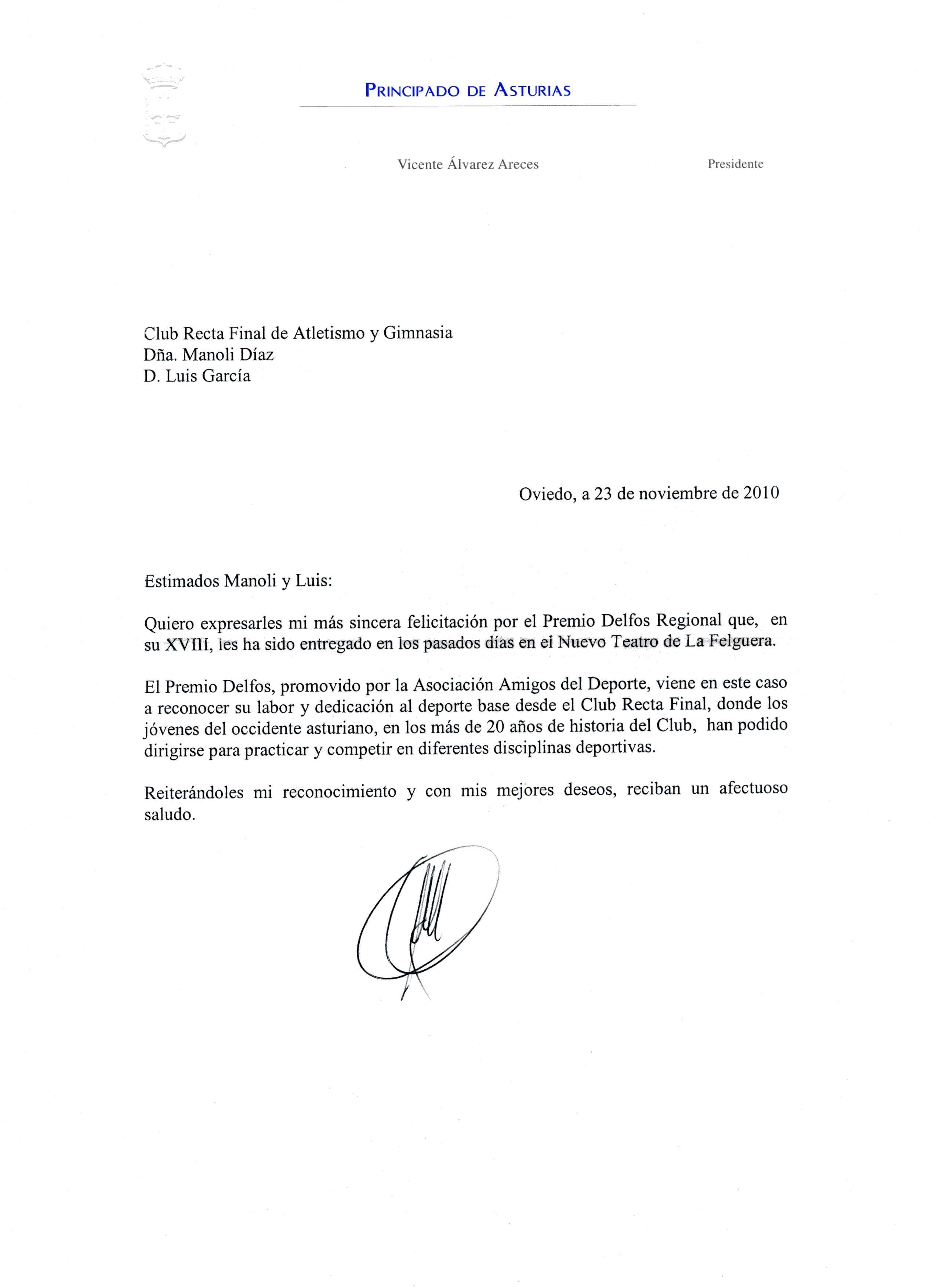 05-12-2010 CLUB Nuevamente traemos a la actualidad los PREMIOS DELFOS a "los valores humanos en el deporte" ante la amable felicitación que nuestro Presidente del Gobierno ha hecho a Luis y Manoli y que ambos agradecen. Nuestros dos directivos y entrenadores desean compartir la felicitación con todos los componentes (Entrenador@s, deportistas, madres y padres) de este maravilloso EQUIPO que tenemos. CARTA DEL PRESIDENTE